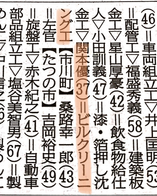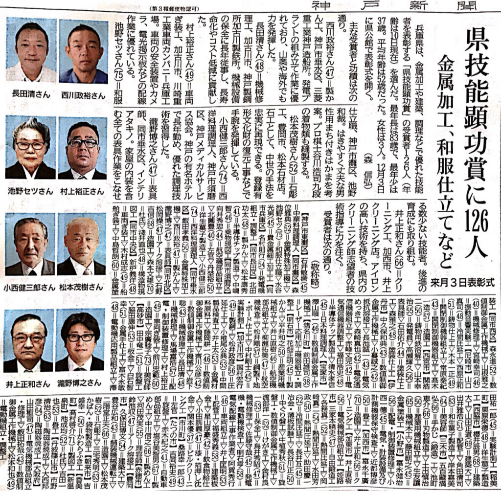 今年度の兵庫県の技能顕功賞受賞者の中に、関本優 会長の名前が掲載されました。